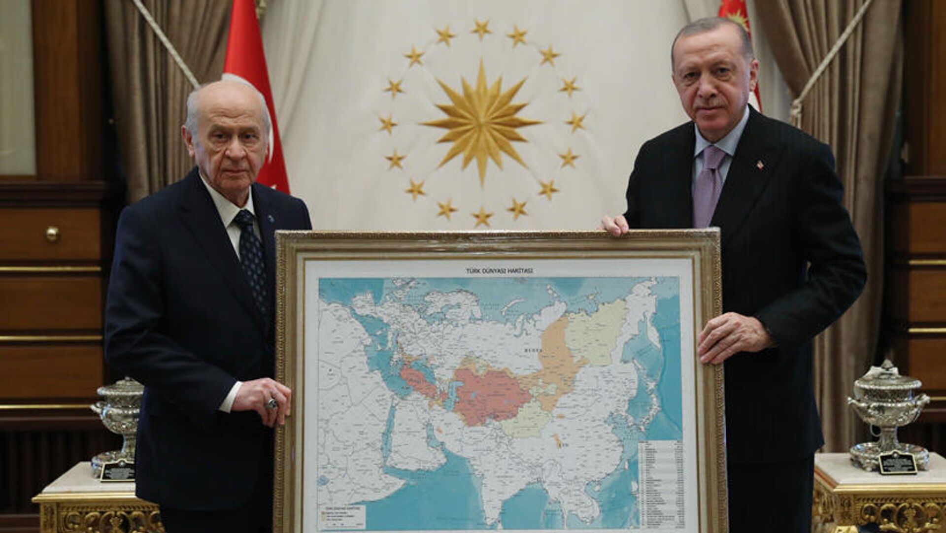 Фото № 2: карта Великого Турана, во время встречи Президента Турции и лидера турецкой экстремистской партии «Серые волки» Бахчели в кабинете Эрдогана