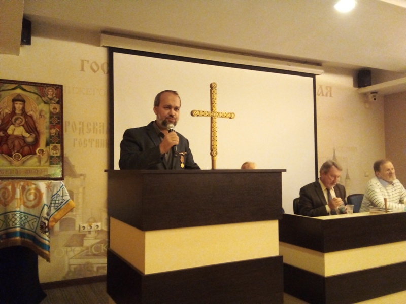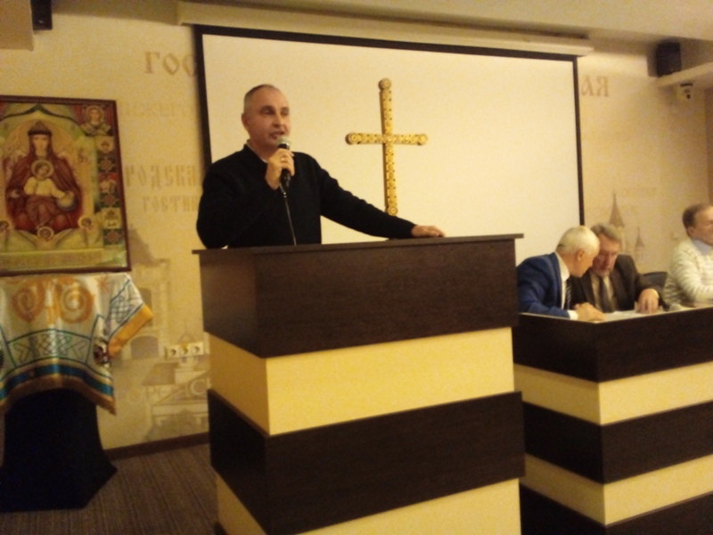 Следующим выступающим был Дмитрий Анин из гор. Москвы, который рассказал участникам конференции о прошедшем 29 октября сего года Круглом столе, в Доме Лосева гор. Москвы, на тему «Апология Соборного покаяния: проблематика понятий и практическое воплощение».