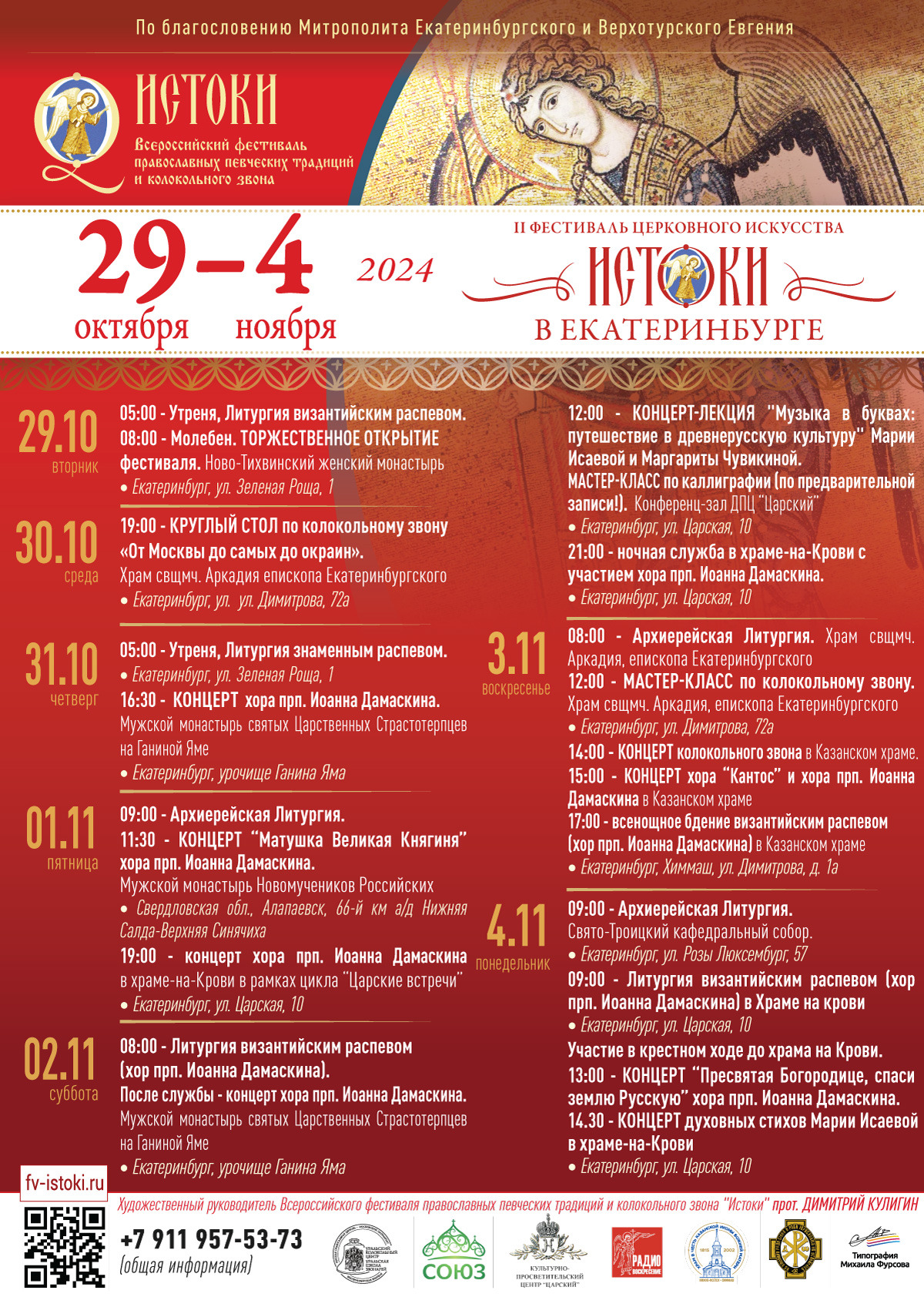 Вот уже второй год подряд целую неделю жителей и гостей столицы Урала и области радует Фестиваль церковного искусства «"Истоки" в Екатеринбурге», который проходит по благословению митрополита Екатеринбургского и Верхотурского Евгения в рамках ещё более крупного проекта – Пятого Всероссийского фестиваля православных певческих традиций и колокольного звона «Истоки».