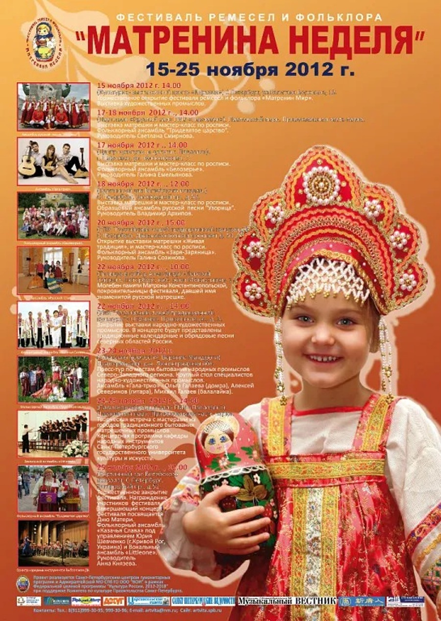На плакате в кокошнике свет моей души Алинушка, старшая внучка, в крещении Матрона. Матроной крестили по той причине, что в святцах имени Алина быть не может, а родителям именно это имя нравилось. Так Алинка стала совершенно НЕФОРМАЛЬНЫМ символом нашего самого любимого фестиваля фольклора и народных промыслов. Одна печаль, после 5 лет успешного процветания, фестиваль стух, так как с уходом Валентины Матвиенко на повышение – Петербург совсем осиротел. Пошёл крупный чес, с грандиозными культурными мегапроектами, с БОЛЬШИМ, настоящим бюджетом. Вот где началось для чиновников настоящее веселье и польза!
