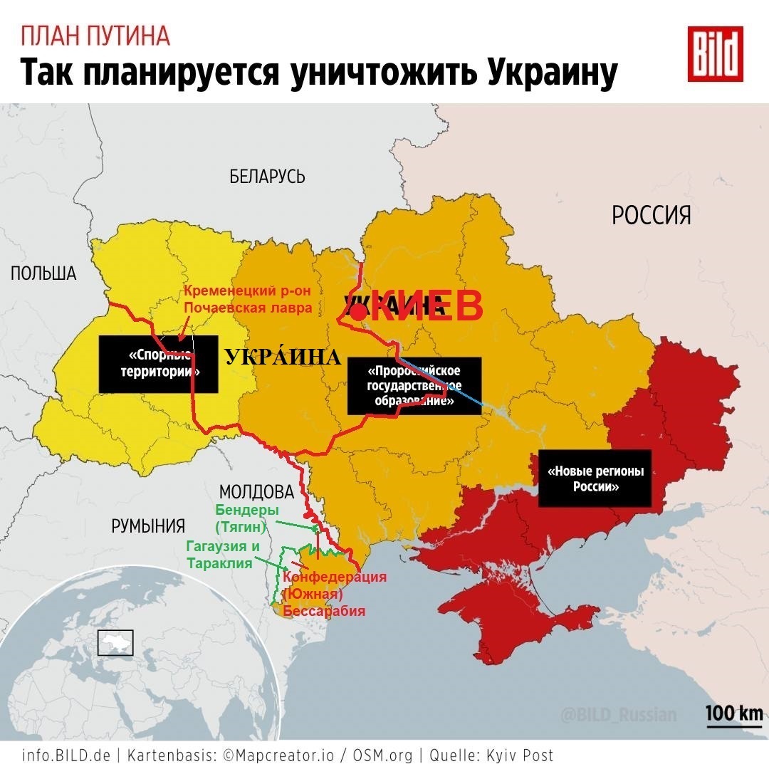 В общем, то, что «Интерфакс-Украина» и «BILD на русском» называют «пророссийским государственным образованием» может располагаться только западнее Киева. Пусть хоть сразу за околицей — за речками Ирпень и Стугна, там, где граница проходила больше века между русско-польской войной 1654-1667 годов и 2-м разделом Речи Посполитой (1793 год), но западнее Киева! Иначе всю эту бодягу и начинать не стоило. Это государственное образование можно даже называть «Украиной», только не с польским ударением (УкраИна), а с правильным: УкрАина, в живой речи: Украйна (см. «Воссоединения Украины с Россией не было, или «Зеленский, учи албанский»). И со столицей где-нибудь в Шепетовке, Жмеринке или Крыжополе. Чисто для прикола, чтобы спрашивать небратьев: «Ну и что вы там квакали на своих болотах, когда русский Киев уже был древним городом согласно решениям Политбюро ЦК КПСС о его 1500-летнем юбилее?».
