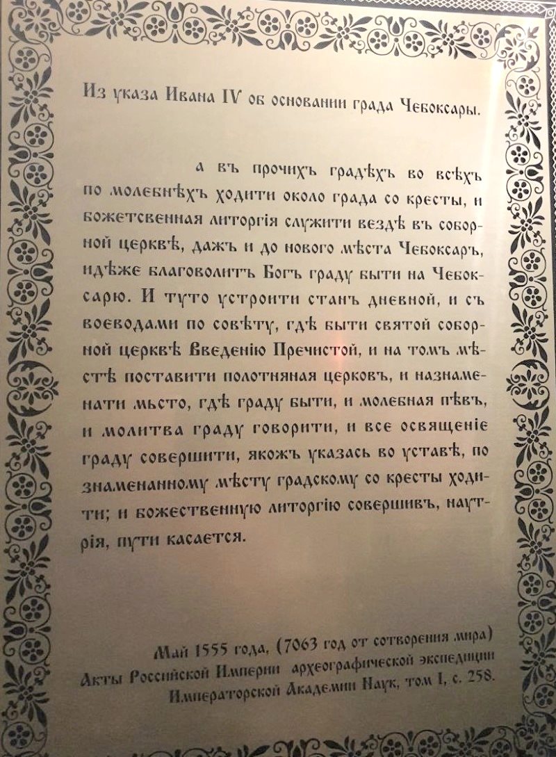 Город основал великий русский правитель, первый царь всея Руси Иоанн Васильевич Грозный в 1555 году. Правда, враги государя, которые и по сию пору, увы, водятся в нашем Отечестве и в нашей Церкви, никак не хотят с этим мириться и нашли в летописи упоминание о походе на Казань воеводы Ивана Руно, который проходил этими местами на 86 лет раньше (1469 г.), и его предлагают считать основателем города. Между тем в кафедральном Введенском соборе Чебоксар на стене висит копия указа Иоанна Васильевича, в которой повелевается у нового места Чебоксар «идеже благословит Бог граду быти» и «быти святой соборной церкве Введения Пречистой». Как видим, государь не только распорядился основать град Чебоксар, но и даже церковь повелел ставить именно в честь Введения во храм Пресвятой Богородицы.