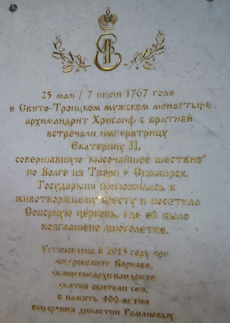 Троицкий монастырь место во всех отношениях примечательное. Он не только является памятником архитектуры, но и связан со многими историческими событиями. Здесь бывала, здесь молилась Императрица Екатерина Великая, когда в 1767 году путешествовала по Волге по направлению к Симбирску. Этот факт отмечен небольшим памятником, установленным недалеко от монастыря и памятной доской на стене монастыря.
