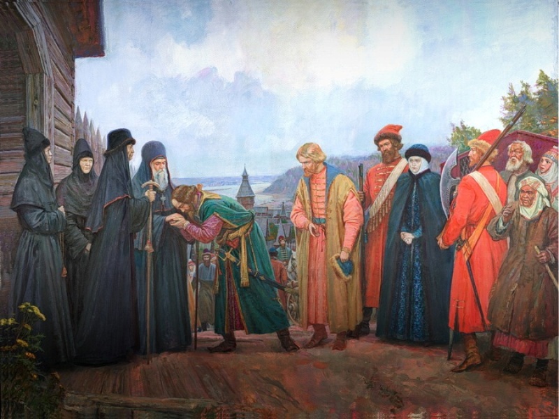 Однако святитель Гурий смотрит, конечно, не на Константина Иванова. Дело в том, что на месте сквера находился Никольский девичий монастырь, основанный еще в 1584 году. Во второй половине XVIII века монастырь был упразднён, стал приходской церковью, которая была закрыта в 30-е годы ХХ века, а в 1940 году взорвана. Монастырь этот в нашей истории известен тем, что здесь была пострижена в монахини и скончалась бабка по матери первого царя Династии Романовых Михаила Федоровича Мария Тимофеевна Шестова (её дочь Ксения Шестова в замужестве Романова – супруга Федора Никитича Романова (будущего патриарха Филарета), тоже была пострижена в монашество с именем Марфа). Марию Шестову привезли в далёкий городок Чебоксар под конвоем в 1601 году по повелению царя Бориса Годунова. Поводом для расправы стал заказ ею иконы убиенного царевича Димитрия с клеймами, на которых люди Бориса Годунова убивают царевича. Разгневанный царь Борис сослал боярыню в дальний монастырь. Об этом напоминает щит с картиной о прибытии Марии Шестовой под конвоем в монастырь. Картина, посвящённая её прибытию, конечно малодостоверна, хотя бы потому, что боярыне было около 50 лет, а на картине совсем молодая женщина. Но картина неизвестного мне автора весьма живописная.