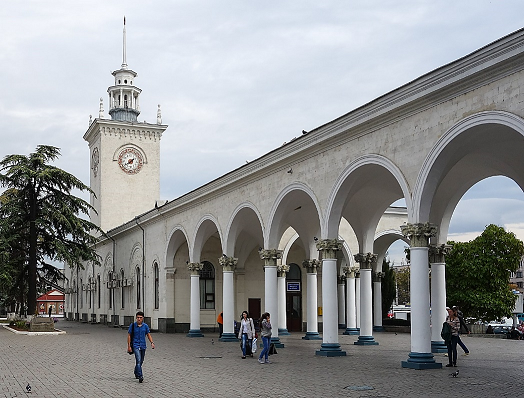 Вокзал в Симферополе, 1946–1951 гг. Изумительное по красоте и планировке здание, образец «южной» архитектуры, сразу создающее у приезжего ощущение тёплого, солнечного юга. Построено из белого инкерманского камня в послевоенном советском стиле «триумф» с использованием итальянских мотивов. Основное здание – симметричное в плане, а по двум сторонам от него устроены две аркады, создающие пространство для внутреннего «итальянского» дворика. Над ним должны были соорудить прозрачную кровлю и создать там зимний сад, но замысел архитектора не был реализован. Похожий вокзал (но не копия) был построен в Сочи (1952 г.).