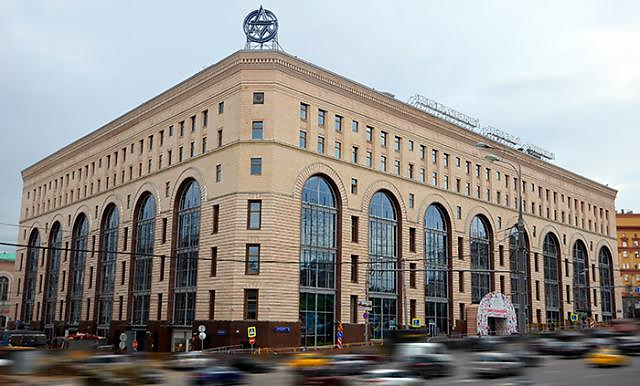 «Детский мир», 1953–1957 гг. (современное фото). Крупнейший в своё время торговый центр не только в СССР, но и в Европе. Имеет 7 наземных и 2 подземных этажа. Первое в СССР здание с эскалаторами. Проект разработан в стиле сталинского классицизма, в процессе строительства проект заставили упростить (декор и мозаичное панно, выполненное П.Д. Кориным, исключили), но довести до полного хрущёвского «аскетизма» не успели. Создавалось как часть ансамбля пл. Дзержинского (ныне Лубянской). Для придания огромному зданию лёгкости применены высокие аркады с витражами. Собственником здания ныне является компания «Галс-Девелопмент» со штаб-квартирой в Москве. Вызывает недоумение составленная из букв «Д» и «М» огромная 6-конечная звезда («Звезда Давида») на крыше – один из символов государства Израиль.