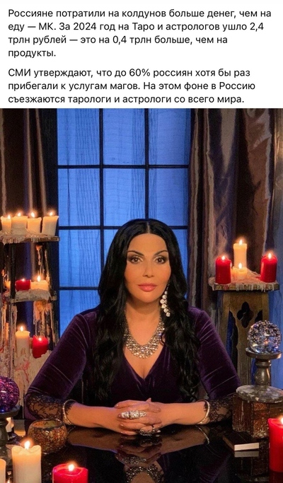 Оккультное мышление в современной России процветает! Как сообщает издание «Московский комсомолец», в статистических отчетах за уходящий год говорится о том, что траты россиян на колдунов стали сопоставимы с их расходами на еду. Что говорит о том, что многим для выживания они необходимы не меньше пропитания. Рынок оккультных услуг в РФ к концу уходящего года оценивается в 2,4 трлн руб. (в прошлом году было 2 триллиона рублей, что сравнивалось аналитиками с расходами населения на продукты питания). Исследования обычно заказывают конкуренты, а у колдунов ближайшие – психологи. Их рынок за истекающий год тоже вырос, но магический превысил его в целых 20 раз.