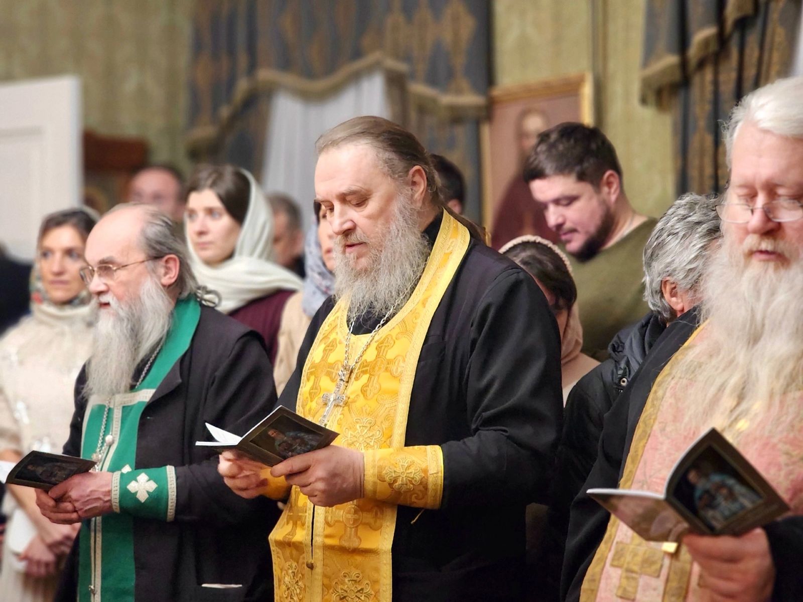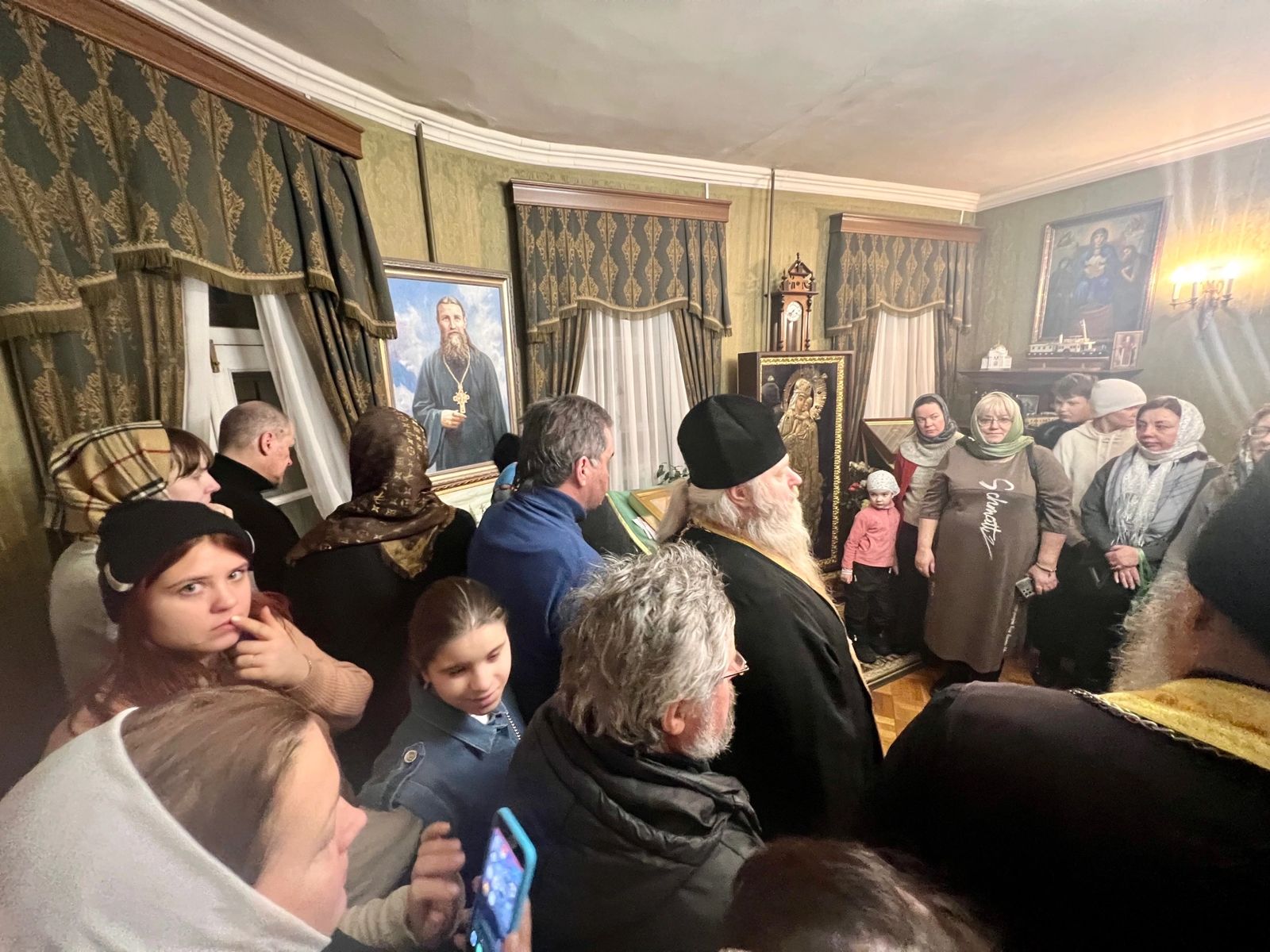 Служили сразу 7 священников. Игумена Киприана (Ященко), игумена Свято-Троицкой Сергиевой Лавры и духовное чадо русского старца архимандрита Кирилла (Павлова) – богослова, педагога, писателя, я помню ещё по Москве. Лично знакомились с ним, пытались заняться возрождением дореволюционного движения скаутов, «Соколов». Здесь же в соборной молитве объединились священники Санкт-Петербургской митрополии: протоиерей Илия Осокин, настоятель храма святых Царственных страстотерпцев Гатчинской епархии; иерей Сергий Учанейшвили, священник храма праведных Симеона Богоприимца и Анны Пророчицы на Моховой в Санкт-Петербурге; протоиерей Геннадий Беловолов, настоятель храма свв. апп. Петра и Павла с. Сомино Тихвинской епархии, директор-хранитель Мемориальной квартиры-музея св. прав. Иоанна Кронштадтского в г. Кронштадте, пригласивший всех нас на это уникальное торжественное мероприятие, и ряд других клириков Русской Православной Церкви.