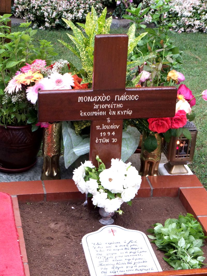 На могиле много возжжённых свечей; на небольшой белой мраморной плите выгравированы стихи старца, написанные незадолго до кончины, и просьба молиться. Целуем деревянный крест, надгробную плиту, с благоговением уносим с собой горстку земли с могилки дорогого старца Паисия. Отсюда не хочется уходить, здесь ощущается такая любовь, что хочется безконечно греться в ней, как под солнечными лучами.