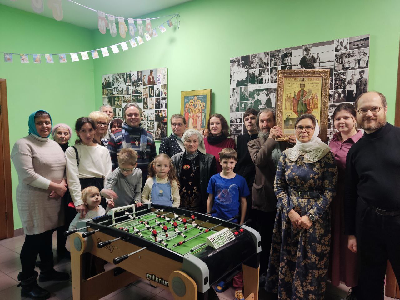 Наталия Геннадиевна (мама отрока Ильи, страдающего этой болезнью) подарила каждому ребенку акафист святому мученику Цесаревичу Алексию и показала икону Цесаревича Алексия, специально написанную для Общества. Именно эту икону нарисовала Настя Кудрявцева, которая вместе с другими детьми смогла пообщаться с гостем из Италии и во время трапезы, и на мастер-классе по росписи елочных игрушек. Расписывая шары и разные фигурки, ребята с интересом расспрашивали итальянца о его жизни, работе, учениках, любимых композиторах, о том, в каких странах он побывал. Когда его спросили, есть ли у итальянцев скороговорки, он на радость детям тут же произнес скороговорку на итальянском языке.