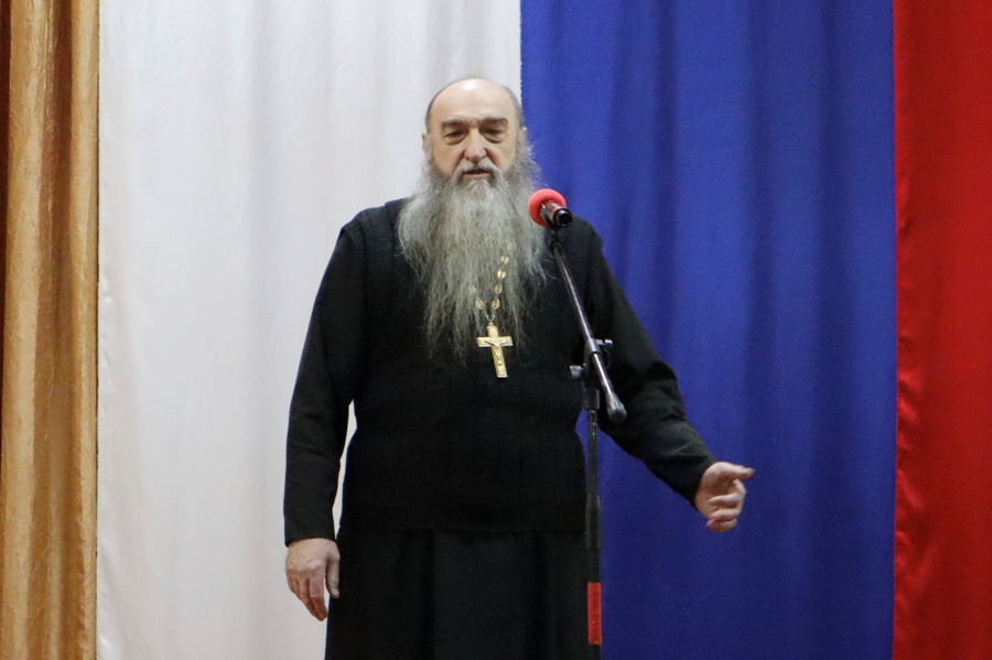 Слово предоставили и о. Вячеславу Беленкову, настоятелю храма в честь Успения Пресвятой Богородицы в с. Которово и близлежащей округи. Напомним, о. Вячеслав в молодости был водителем и объездил всю Европу, бывал в Хорватии в 1991 г., где своими глазами видел зверства при конфликте сербов и хорватов, где в это же время воевал в Боснии и Герцеговине атаман В.В. Камшилов. В своей проповеди он упомянул многих касимовских знаменитостей, о которых мало знает молодое поколение. Он вышел на сцену с иконой «Святого Благоверного князя Александра Невского». Следует пояснить, что святой князь преставился в Городце Мещёрском, что доказал атаман В.В. Камшилов и местные краеведы. Они же нашли сведения, что знаменитый атаман Ермак Тимофеевич Оленин (1530/1540 —1585) — имел земли в Сеитове и Баишеве за пограничную службу царю и Отечеству.