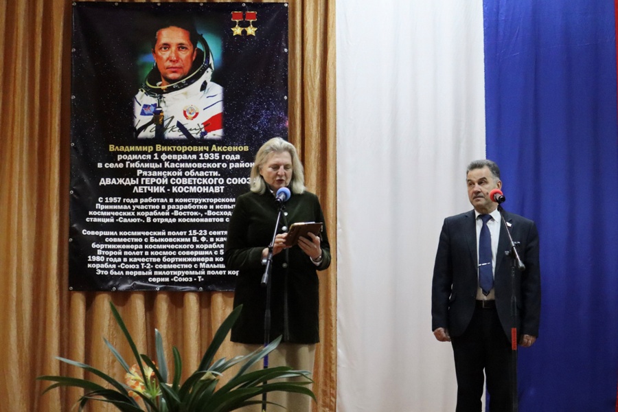 В.В. Камшилов на свои средства изготовил памятные доски космонавту, одну установили на здании Касимовского индустриального техникума, в котором учился будущий космонавт накануне 31 января, а вторую — для установки на родовом доме Аксёнова в Гиблицах — освятили прямо в зале на вечере!