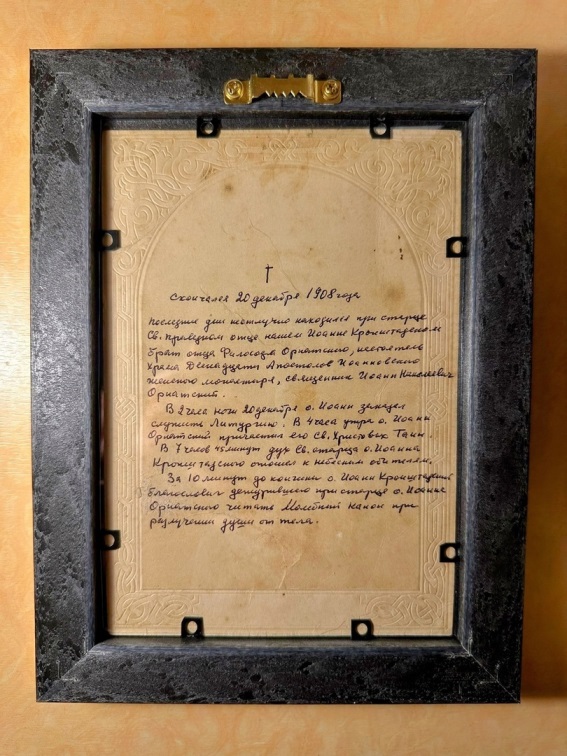 Ещё в 2022 году он приобрёл в антикварной торговле редкий литографический портрет св.Иоанна Кронштадтского с книгой в руках. На оборотной стороне литографии сохранилась интересная рукописная надпись, сделанная каким-то почитателем св.Иоанна Кронштадтского с описанием последних часов и минут жизни Всероссийского пастыря.