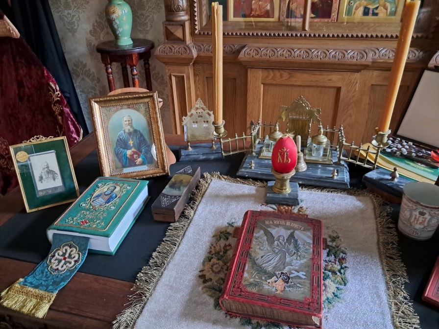 Экскурсию по комнатам мы совершали уже с портретом отца Иоанна в руках, поэтому она немного походила на крестный ход. В течение экскурсия внутренне размышлял, где лучше поместить новообретённый портрет? Подсказал сам портрет о.Иоанна, на котором он держит книгу в красном переплете - видимо издание "Моей жизни во Христе". Когда увидел в Кабинете Батюшки на его письменном столе похожее тоже в красном переплете прижизненное издание дневника "Моя жизнь во Христе", тогда решил, что наиболее уместным будет поставить портрет прямо на письменном столе Дорогого Батюшки.