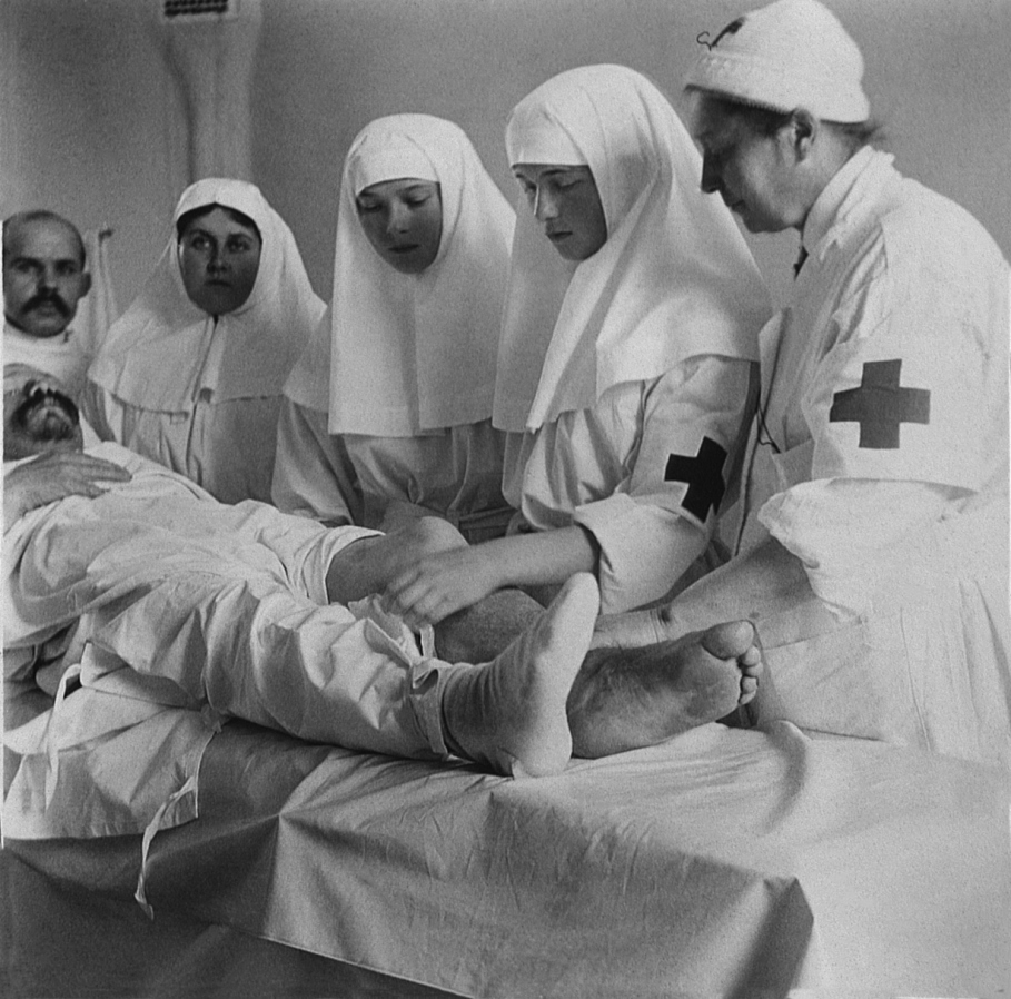 Великие Княжны Ольга и Татьяна под руководством доктора Гедройц В.И. делают перевязку. 1914 год