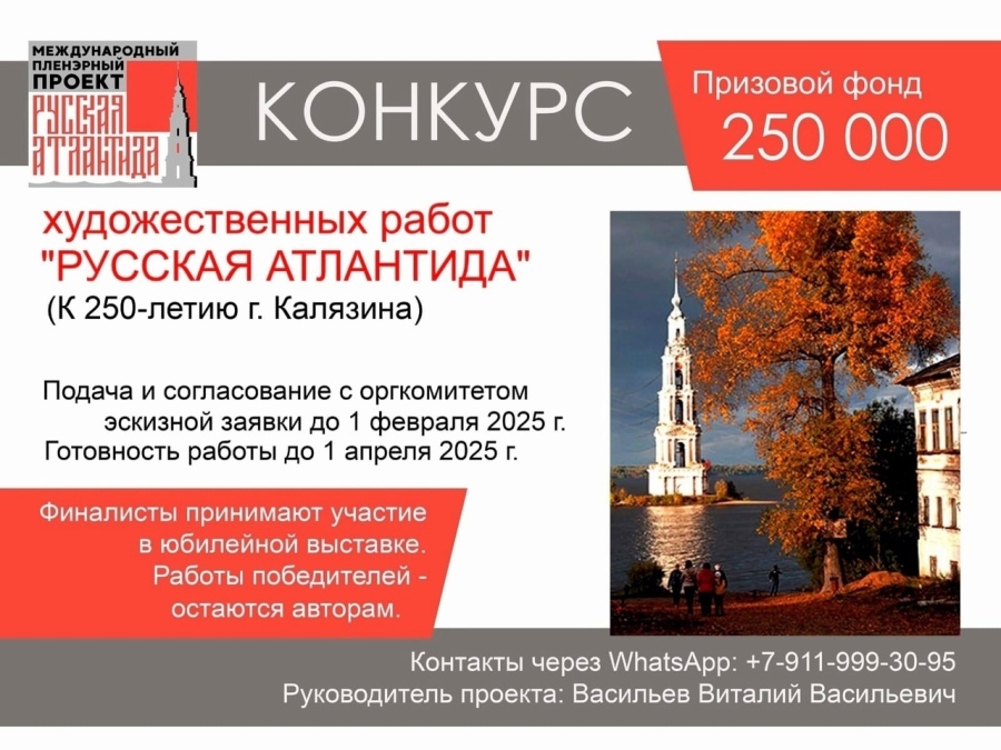 В настоящее время на финишный этап выходит конкурс художественных работ «Русская Атлантида», посвященный 250-летию присвоения Калязину статуса города. Конкурс организован Международным пленэрно-выставочным движением «Русская Атлантида» совместно с Администрацией Калязинского округа. В профессиональное жюри конкурса входят: Павел Никонов – Академик Российской Академии художеств, Народный художник СССР; Людмила Юга – член-корреспондент Российской Академии художеств, Народный художник РФ, Михаил Стоячко – член Союза художников России, директор детской художественной школы Калязина и Виталий Васильев – академик Петровской Академии наук и искусств, Заслуженный работник культуры РФ, который ведёт основную организационную работу по продвижению конкурса в жизнь.