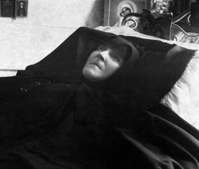 Вполне допускаю возможность совмещения полулежащей поясной фигуры матери Марии в соединении с рамой окна или же спинкой кровати, а может быть с иконой Божией Матери «Взыскание погибших», которая была у неё в святом углу и вида на фотографиях.