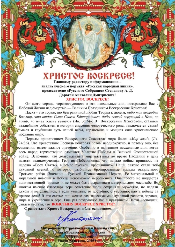 В редакцию «Русской народной линии» поступило Пасхальное поздравление митрополита Петрозаводского и Карельского Константина (Горянова).