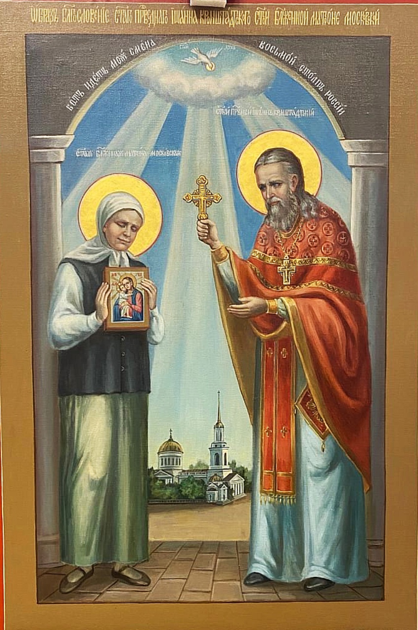 Я ей тут же позвонил, а она удивлённо воскликнула: «Батюшка, я как-то уже писала небольшую келейную икону Иоанна Кронштадтского и Матроны Московской для протоиерея Михаила Протопопова из Австралии. Буду только рада написать настоящий храмовый образ...».