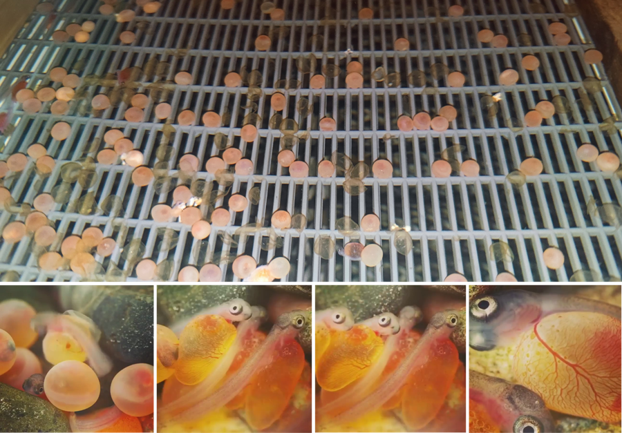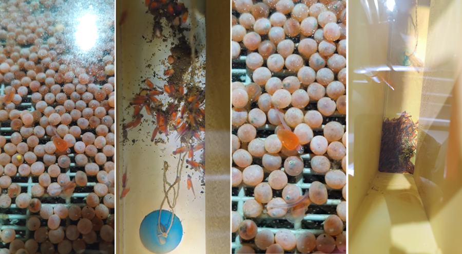 Первая стадия – инкубация икры. Вторая – пигментация глазка, которая также относится к инкубации. А как из оболочки вышли – маленькие, похожие на рыбок с оранжевым пузиком – это личинки с желточным мешком. Это уже процесс выдерживания личинок.