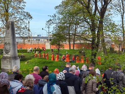 Предваряя молебен, отец Максим Плетнев отметил: «Сегодня день памяти иконы Божией Матери "Неупиваемая Чаша". Как вы все знаете, это икона, перед которой молятся люди, которые так или иначе столкнулись с бедой винопития или наркомании, страдают от этого, или же их близкие люди страдают и молятся перед этой иконой. Сегодня праздник Пресвятой Богородицы, и Пасха продолжается. И вот у нас сейчас будет праздничный пасхальный молебен и в то же время молебен пред иконой Божией Матери "Неупиваемая Чаша". Дальше после молебна мы пойдем крестным ходом по Никольскому кладбищу, потом крестным ходом мы идем в Синий зал, главный епархиальный зал Санкт-Петербургской митрополии, где состоится праздничный концерт».