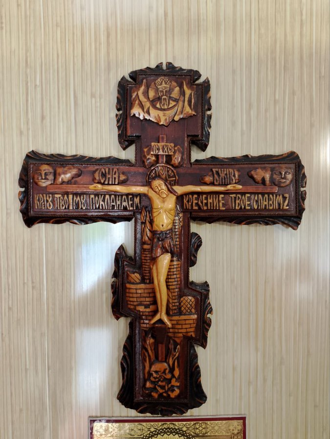 Мы побывали у стелы, увенчанной восьмиконечным крестом в центре посёлка. Она посвящена всем павшим воинам. Вначале предполагалось на этом месте устроить детский сад. Была торжественная закладка, освящение места – всё это активно освещалось в прессе, но потом всё заглохло. Может быть, на это повлияла монетка, брошенная «на счастье» в основание фундамента одним из руководителей?
