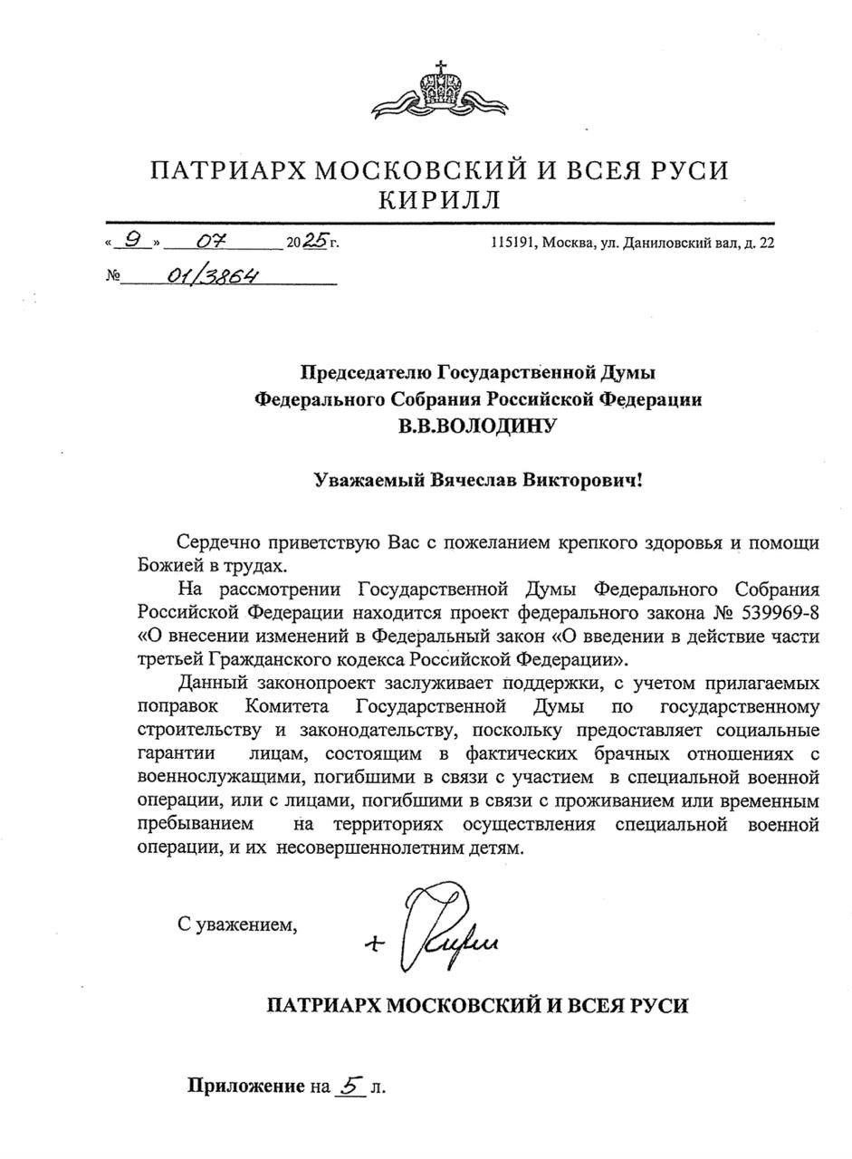 По мнению патриарха, инициативу следует поддержать, так как она «предоставляет социальные гарантии лицам, состоящим в фактических брачных отношениях с военнослужащими, погибшими в связи с участием в специальной военной операции, или с лицами, погибшими в связи с проживанием или временным пребыванием на территориях осуществления специальной военной операции, и их несовершеннолетним детям».