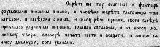 Страница Панонского жития Кирилла «Обрете же ту евангелие и псалтырь роуськыми писмены писано»