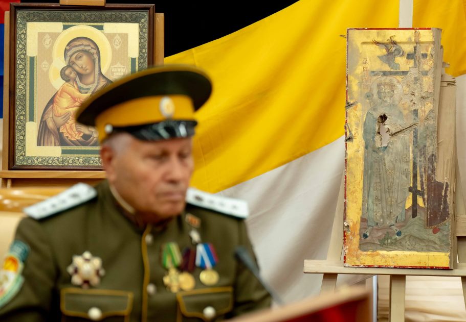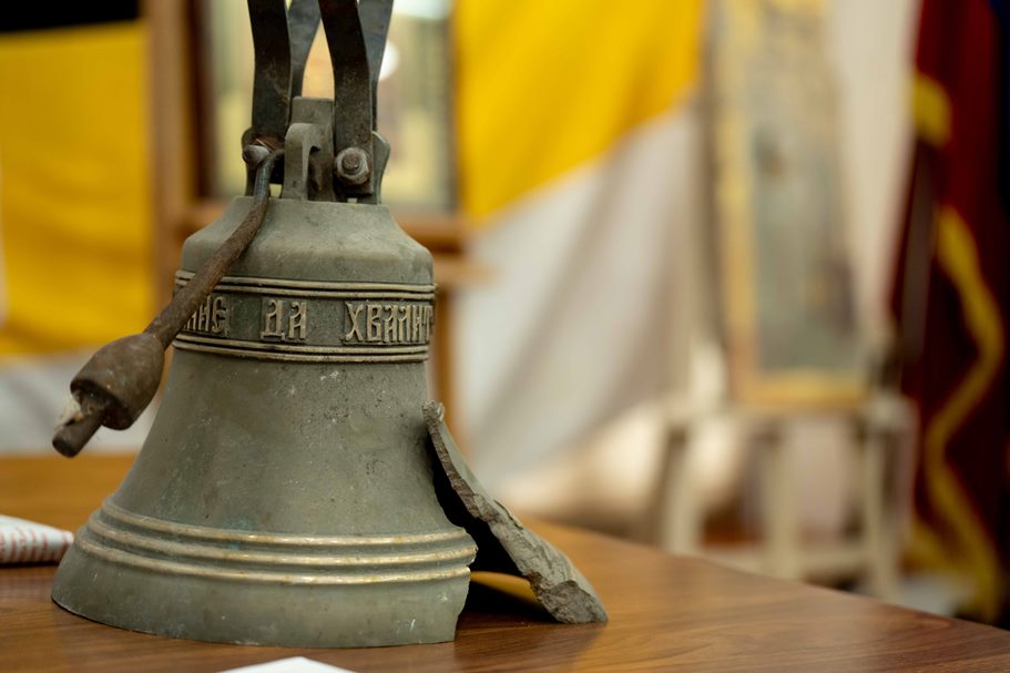 Среди этих святынь простреленная икона святых равноапостольных Константина и Елены, а также разбитый выстрелами колокол из храма, в котором служил отец Александр до начала боевых действий.