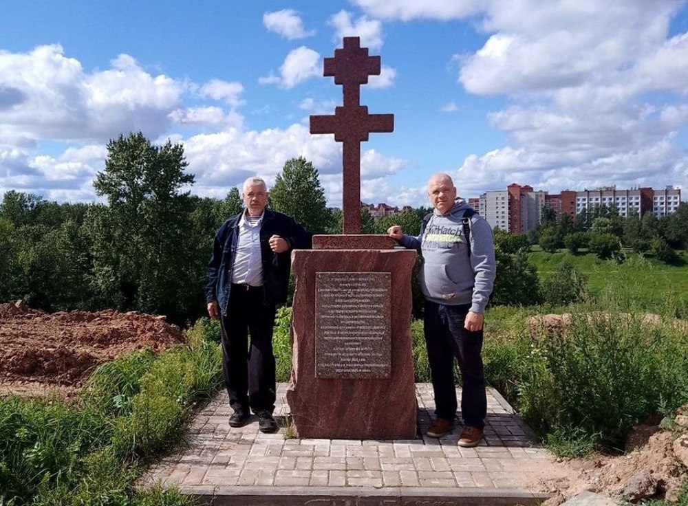 Члены Союза краеведов России, члены патриотического российского проекта «Памяти предков будем достойны» Алексей и Андрей Буховецкие возле памятного знака, где будет стоять Софийский собор