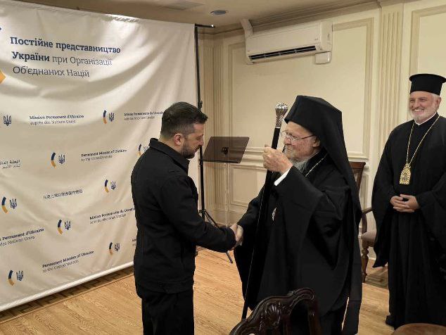 На фото: п. Варфоломей приветствует нацистским лозунгом «Слава Украине» просроченного Зеленского, рядом арх. Элпидофор. Newsbreak.gr