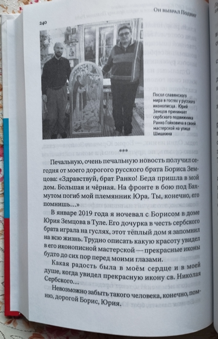 Эту книгу получил в подарок тем же вечером от Бориса, получив тем самым трилогию об этом истинном православном рыцаре. В книге также есть мой отзыв об этом великом человеке, трудно сдержать эмоции. Мне посчастливилось провести ночь в его доме в Туле, насладиться прекрасными иконами в его живописной мастерской, послушать прекрасную музыку его замечательных детей, посетить вместе с ним музей знаменитой Куликовской битвы... На странице 240 книги помещена моя фотография с Юрием в его мастерской с подписью: «Посол славянского мира посещает русского иконописца»: Юрий Земцов принимал сербского подвижника Ранко Гойковича в своей мастерской на улице Шишкина.