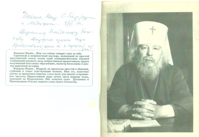 …Митрополит назначал встречи в своей резиденции на Каменном острове, подальше от чужих ушей и глаз, в старинном, сильно обветшавшем особняке. И приходили к нему люди интересные… В один из зимних вечеров 1994 года, например, по колено в скрипучем снегу (мы срезали путь), к калитке особняка проследовал физик с мировым именем Вениамин Соколов, в недавнем прошлом – один из руководителей расстрелянного Верховного Совета, а на тот момент – главный кандидат от Государственной Думы и военно-промышленного комплекса на пост Председателя Правительства России. О, ему было о чём поговорить с владыкой Иоанном! Хозяина дома живо интересовали новости большой политики. Видно было, как радовался гостям митрополит, – в насквозь выстывшей столовой, за большим, человек на двадцать, столом, – Иоанн сам брался за горлышко графина, очень по-домашнему руководя скромной трапезой…