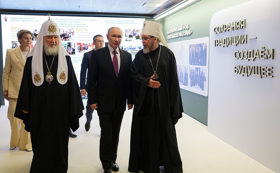 Затем Владимир Путин посетил церковно-общественную выставку-форум «Православная Русь – к Дню народного единства». В этом году экспозиция посвящена 80-летию Победы в Великой Отечественной войне - «Великая Победа. Россия — моя история».