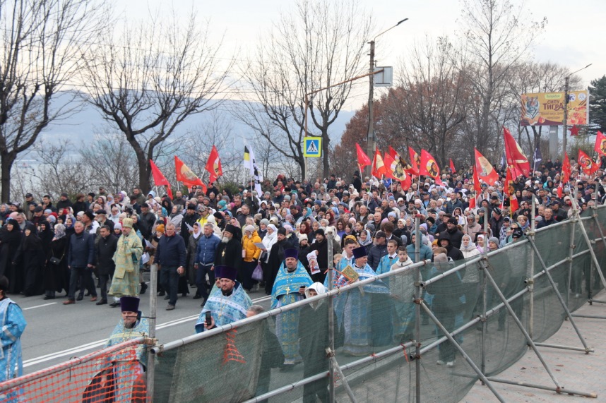 Комментарий: Таких массовых церковных мероприятий в нашем городе фактически не было с того момента, когда Крестные Ходы в честь Казанской иконы Божией Матери двигались от Кафедрального собора до Муниципального Центра культуры, путь которых составлял чуть более километра. После пандемийно-ковидных ограничений эти молитвенные шествия и вовсе были отменены. Но сейчас, когда пришло время Святой Руси соборно вставать на молитву, вновь над городом у моря зазвонили колокола. Вот что пишут блогеры в сети: В разных городах России прошёл крестный ход в честь Дня народного единства. Масштабы впечатляют!
