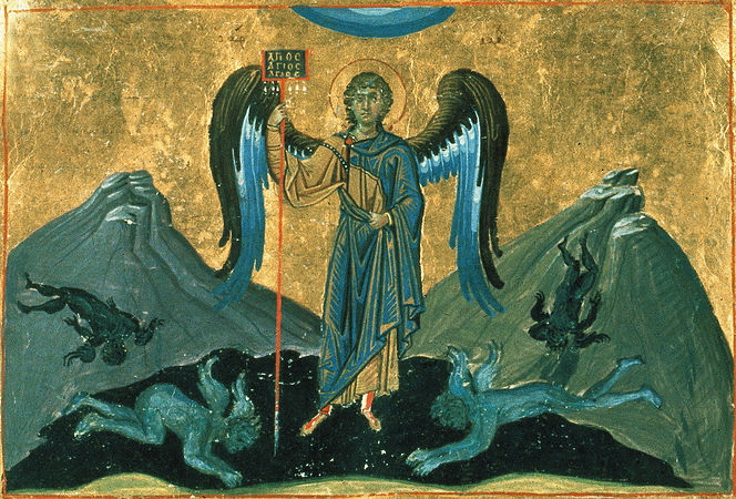 А на всенощной праздника Архистратига Божия Михаила и всех Небесных Сил бесплотных мы слышим евангельскую притчу о Царстве Небесном (Мф. 13, 24—30, 36—43). Она раскрывается в рассказе о человеке, который посеял доброе семя на своем поле, но пока он и его работники спали, приходит враг и сеет плевелы среди пшеницы. Слово «плевелы» может означать сорняки, которые трудно отличить от пшеницы до созревания: сходство, кажется, идет до самой глубины, даже корни этих двух растений переплетаются. Мы стоим перед непостижимой тайной добра и зла, которую мы можем разрешить только в даре свободы. Откровение говорит нам, что вся история человечества развертывается на границе видимого и невидимого в нашей устремленности к свету, который мы призваны познать из смертного своего падения. Ангелы участвуют в этих событиях от начала до конца. Мы видим, как они открывают семь таинственных печатей истории, как трубят в семь грозных труб и проливают семь чаш гнева Божия на землю.