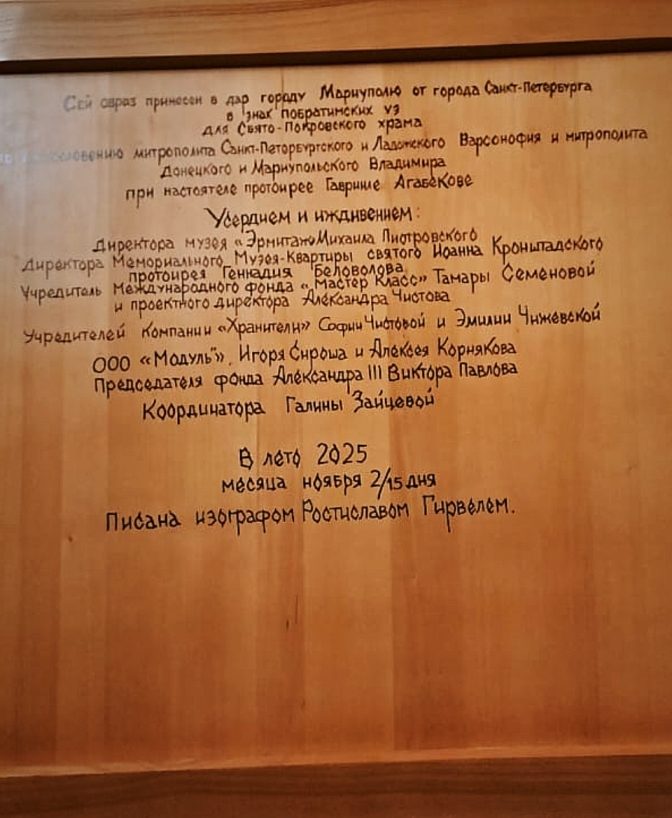 В предоставленном слове я также высказал мысль о том, что этот образ станет знаком духовной связи Санкт-Петербурга и Мариуполя, своего рода молитвенным мостом между нашими городами.