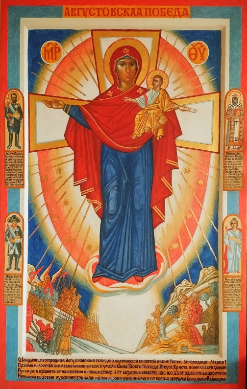 Таким образом, Матерь Божия в этом образе нареклась царским титулом как Царица неба и земли. И, стало быть, Августовская Победа могла быть дарована России при сохранении веры в Бога и сохранении верности Помазаннику Божию, то есть можно сказать, Победа была обетована Августовской России.