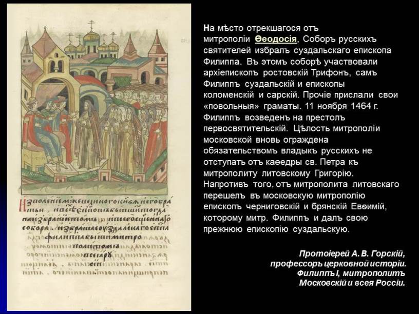В своём выступлении Фёдор Николаевич акцентировал внимание на византийских корнях будущего митрополита, который родился в начале XV века в Византии и был патриаршим клириком-чиновником, проживавшим в Константинополе. При пострижении он получил имя Филипп в честь апостола, а его прибытие на Русь датируется, вероятно, вскоре после кончины митрополита Фотия (1431 г.). На Руси Филипп обрусел, и его греческое происхождение было почти утрачено.