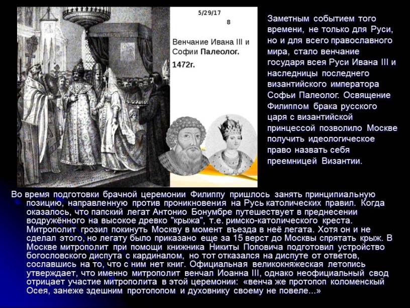 Одним из значимых событий того времени стало венчание Ивана III и Софьи Палеолог, наследницы последнего византийского императора. Митрополит Филипп освятил этот брак, что позволило Москве претендовать на идеологическое наследие Византии. Официальная великокняжеская летопись утверждает, что именно митрополит венчал Иоанна III, однако неофициальный свод отрицает участие митрополита в этой церемонии.