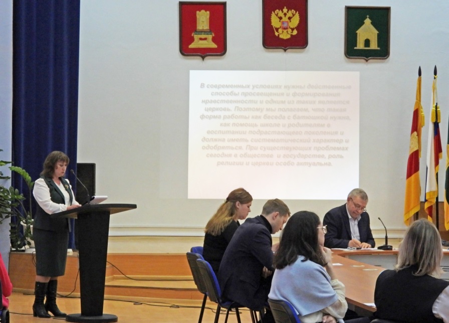 С аналитическим обзором о работе по духовно-нравственному воспитанию детей в Калязинском округе в прошлом и текущем учебных годах выступила Анна Афонина - заместитель Главы Администрации округа, начальник Управления образованием.