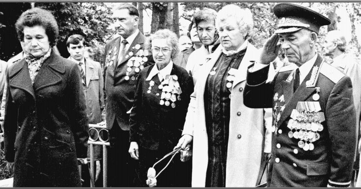 Дань памяти павших партизан. Крайний справа – А.В. Назаров, крайняя слева – Герой Советского Союза, бывшая военная летчица М.В. Смирнова. 1980-е гг.