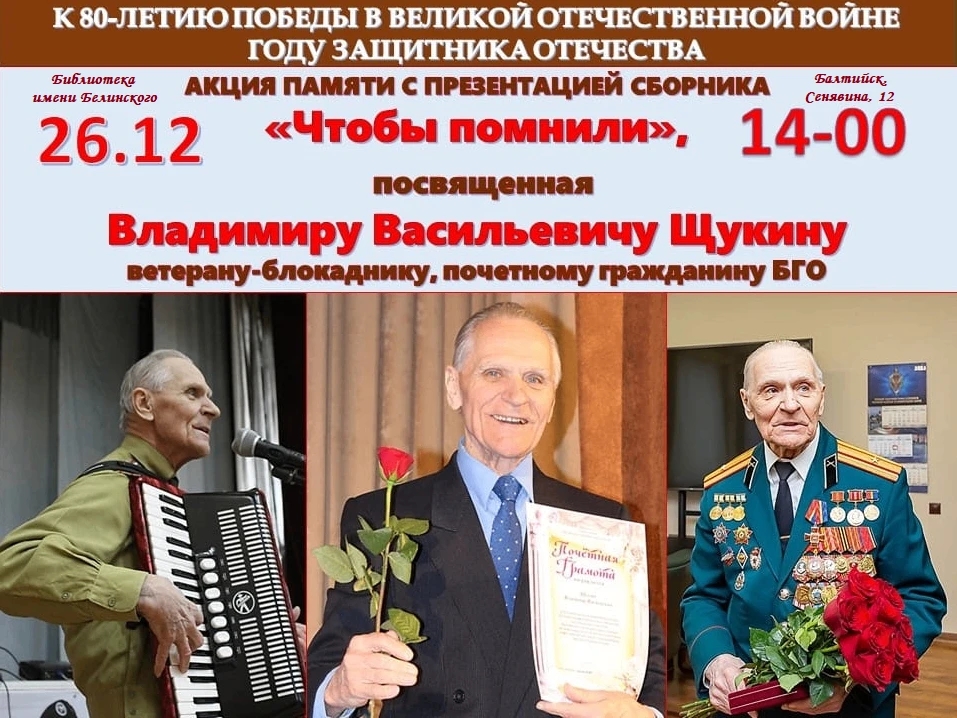 Побывала на памятном мероприятии в библиотеке имени В.Г.Белинского города Балтийска, где проводилась акция памяти к 80-летию Великой Победы с презентацией сборника «Чтобы помнили», посвященного Владимиру Васильевичу Щукину, ветерану Великой Отечественной войны, блокаднику, Почетному гражданину МО БГО. Сборник вышел под редакцией Татьяны Викторовны Марьясовой. Помогали его создавать школьники, музеи, ветераны, библиотеки, творческие люди города Балтийска и школьники поселка Петрово Гурьевского района.