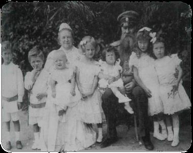 Ещё один поворот судьбы: рядом с Колей стоит его старшая сестра Маричка – Мария Сергеевна Мальцова, в замужестве Всеволожская. Это она, всегда тосковавшая по Симеизу, первая навестит его в советское время и даже разыщет своих сверстниц. Возможно, Мария Сергеевна помнила крымские тревожные рассказы о своей тезоименитой тётушке Марии Родионовой, оставшейся в СССР, и надеялась что-то услышать о её судьбе. На коленях у дедушки, генерала от инфантерии Владимира Анатольевича Барятинского, сидит трёхлетняя Елена – будущий художник-дизайнер и жена бельгийца Мишеля Виттука. И она не побоялась в 1965 году приехать в Киев, а через несколько лет – в Ялту, где, после заказанной в соборе панихиды по бабушке Надежде Барятинской и за всех убиенных, всё-таки имела неприятную беседу с сотрудниками КГБ. Самая старшая и самая неординарная из всех детей Щербатовых – Надежда, на снимке стоит, прислонившись к деду справа - дожила до 99 лет. С первым своим мужем Иваном Стенбок-Фермором она обручилась в Ялте и родила ему двух сыновей - Ивана и Андрея. Женщиной она была красивой, вполне самостоятельной и очень энергичной. В 1930-м работала манекенщицей и одно время заведовала филиалом фирмы «Шанель» в Биаррице. В 1935 году от второго мужа, графа Луи де Бранта, Надежда родила девочку, названную в честь матери и бабушки Наденькой. В годы войны бесстрашная мать Наденьки, вместе с её старшими братьями, помогала французскому Сопротивлению, арестована гестапо и только чудом была спасена. После её спасения в камере гестапо на стене осталась надпись: «здесь хуже, чем в чека…».