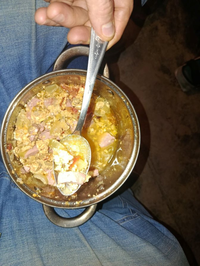 Ставим на плитку кастрюлю с двумя столовыми ложками сливочного масла, мелко нарезанными луковицей и помидориной, добавляем обычную варёную колбасу – кусок с кулак, изрезанный ломтиками, можно сардельки, и варим всё минут пять, помешивая. Потом запускаем туда три яйца, быстро перемешивая ещё минут пять, солим и на стол. Вот и все секреты насытить троих бойцов!