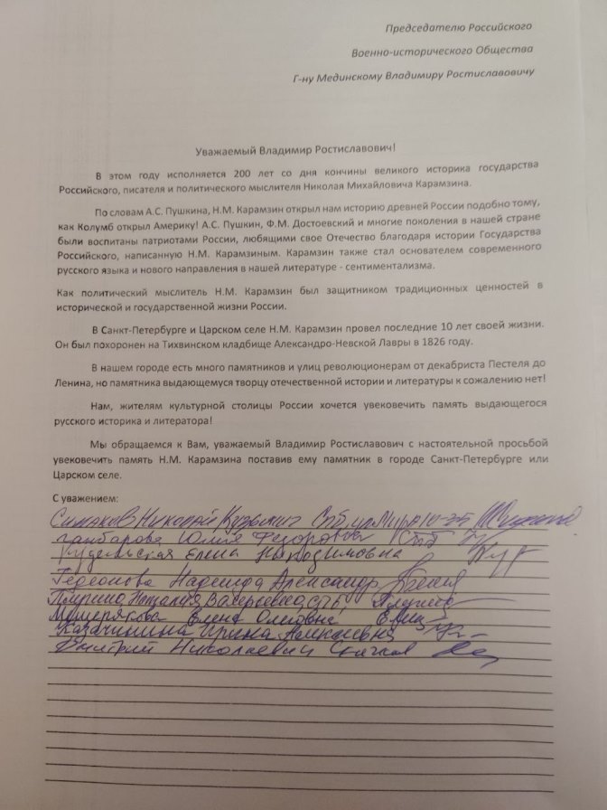 Мы обращаемся к Вам, уважаемый Владимир Ростиславович с настоятельной просьбой увековечить память Н.М.Карамзина, поставив ему памятник в городе Санкт-Петербурге или Царском селе».
