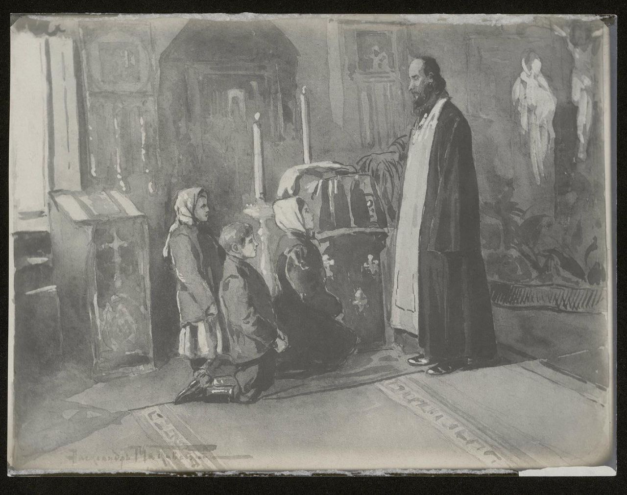 Маковский Александр Владимирович. Сергиевская школа трезвости. Плоды уроков трезвости. Дети приводят мать дать «обет трезвости»: акварель А.В. Маковского, 1909 г. фотография. [1910?]