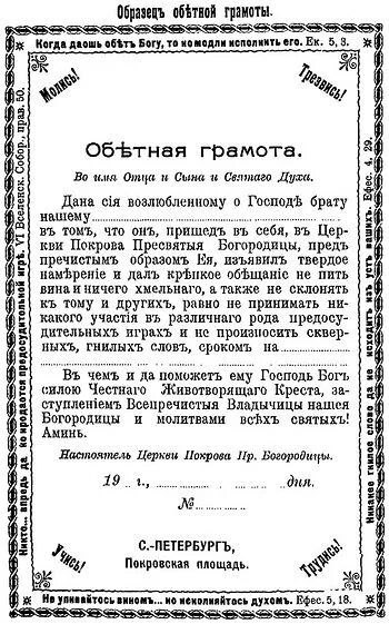 Как отметил Д.И. Стогов, благодаря С.А. Рачинскому и другим подвижникам, практика обетов трезвости получил широкое распространение. Практиковал обеты и святой праведный Иоанн Кронштадтский, и священник Александр Рождественский, который в 1898 г. организовал Александро-Невское общество трезвости.