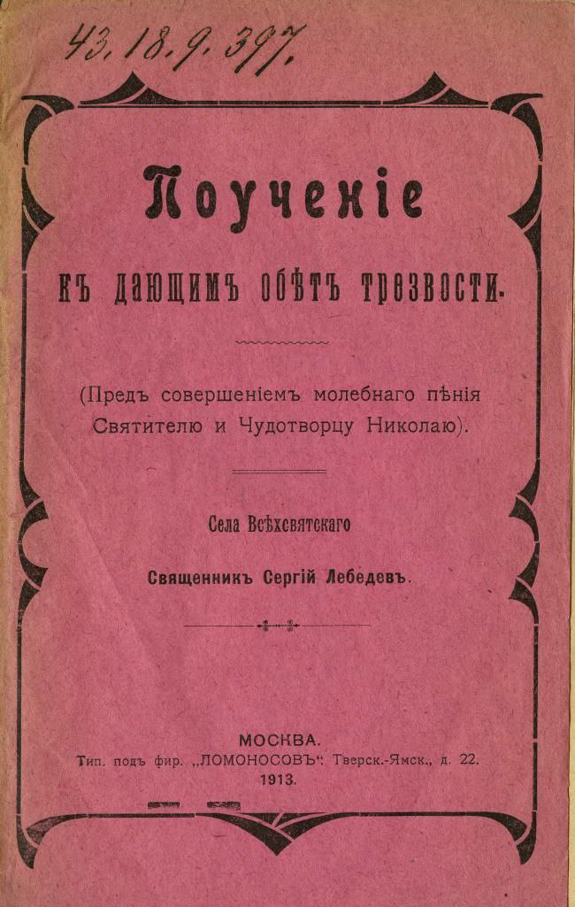 Докладчик также привел некоторые дореволюционные книги, в которых в той или иной степени раскрыта проблема обетов трезвости, например, следующие: Розанов Н.П. Обет полной трезвости как необходимое условие успеха Общества трезвости. М.: Московское епархиальное общество борьбы с народным пьянством, 1912; Мордвинов И.П. Общество трезвости, жизнь и работа в нем. СПб.: Александро-Невское общество трезвости, 1910 и др.
