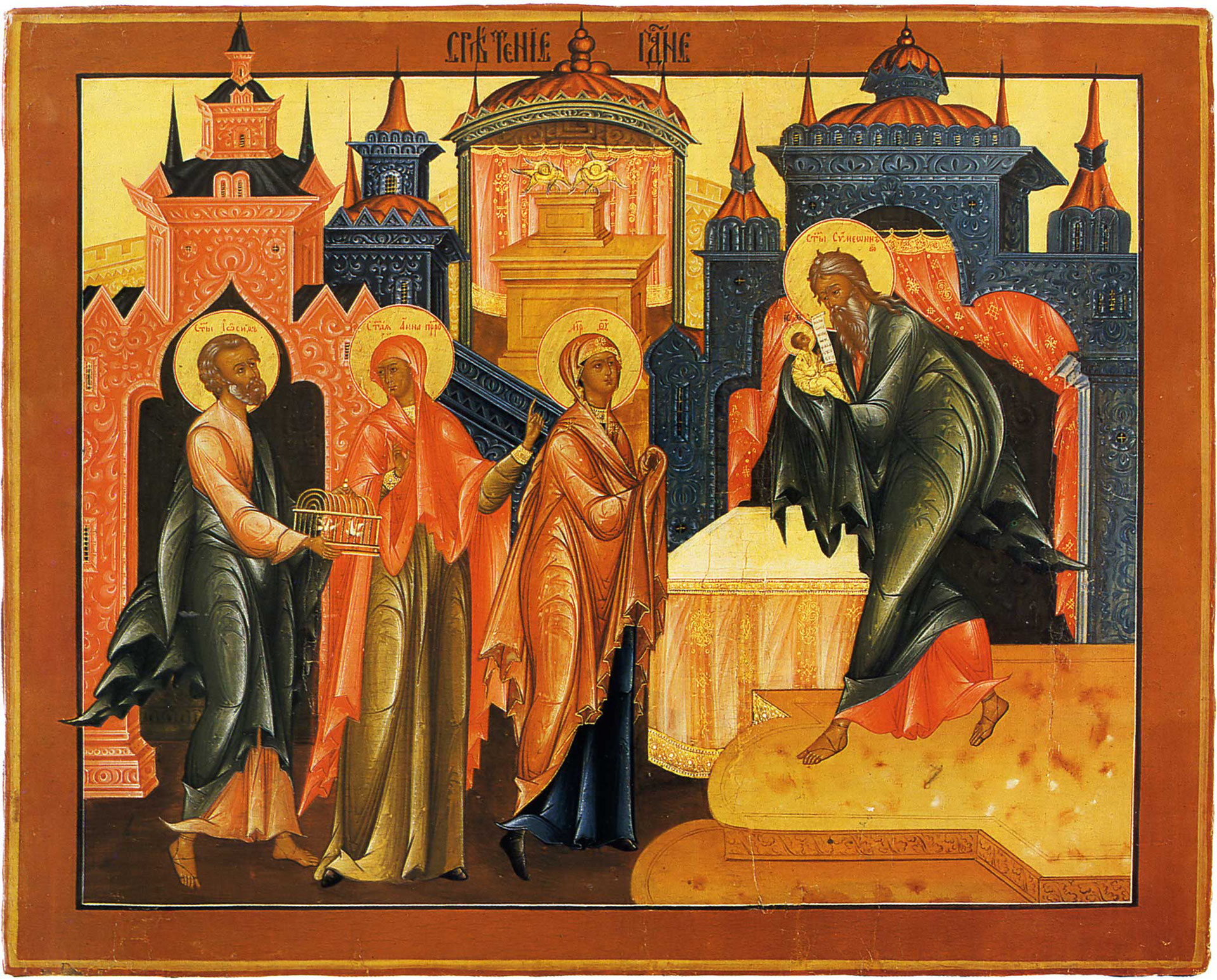 Пречистая Божия Матерь и праведный Иосиф хранят молчание пред Старцем. Они не рассказывают ему ничего из того, что узнали от пастухов Вифлеема и от волхвов. Волхвы ушли домой иным путем. Пастухи возвратились к своим полям. Сын Давидов входит в Храм без царских почестей. Небо не открылось, ангелы не воспели хвалу Богу. Не воссияла звезда. Ни одного знамения не было явлено от Бога, ни одного чуда не совершилось. Ничего не произошло. Ничто не свидетельствовало, что этот Младенец — Христос. Пречистая Дева стоит со Своей нищенской жертвой — двумя птенцами, и Младенец — похожий на любого младенца из самой бедной семьи.